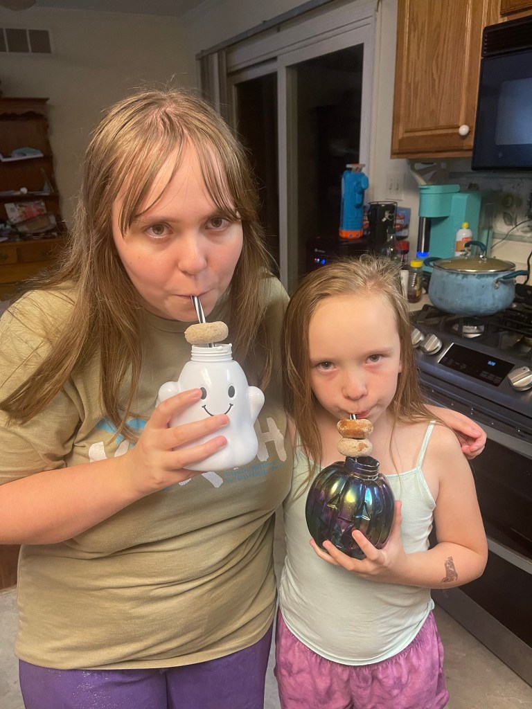 - Pour into small cups and top with whipped cream. Put one or two donuts on each straw and serve.