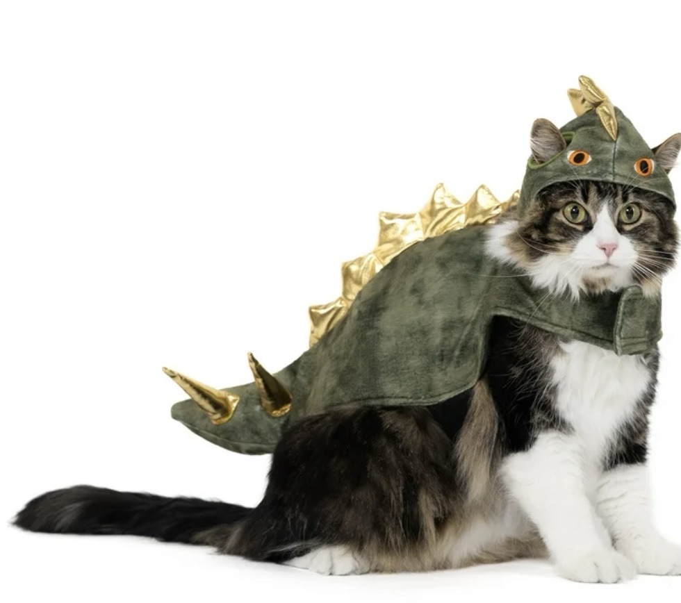 The product description says dinosaur, but I keep thinking dragon. Maybe it’s the extra set of eyes. πŸ€·β€β™€οΈ Either way I like the idea of having my cat look like he is about to defeat the knights of the round table.