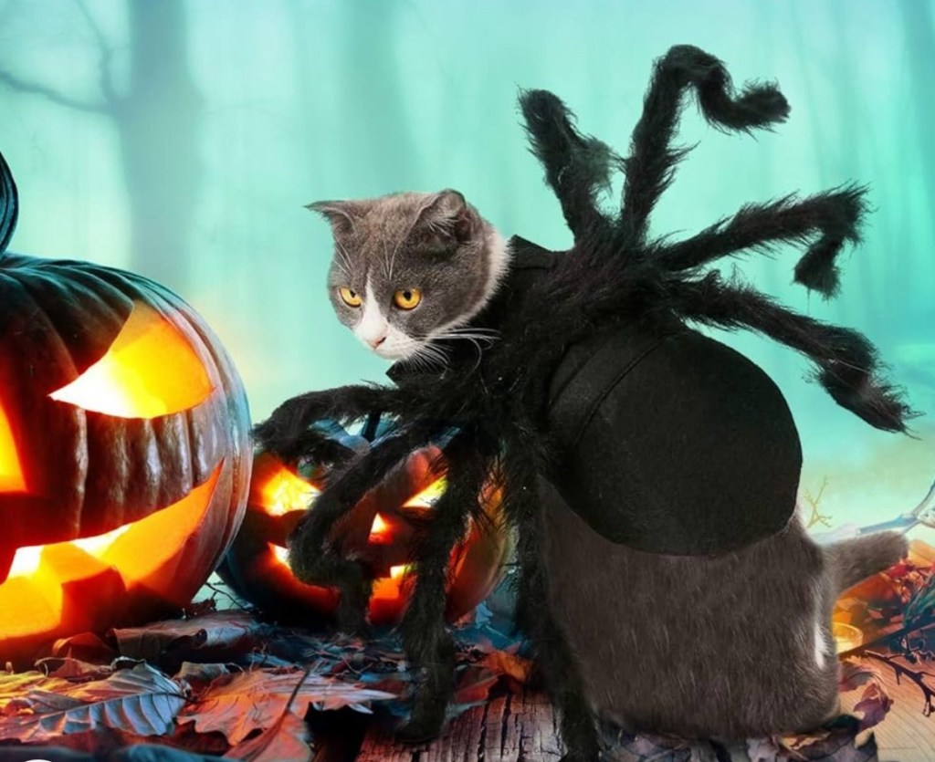 My beagle is a spider this year. I think there is something super creepy about these arachnids, so it’s fitting to have one for our celebration each year. Plus next year I can put up our decorations and pose the cat with our giant animated one in the yard.