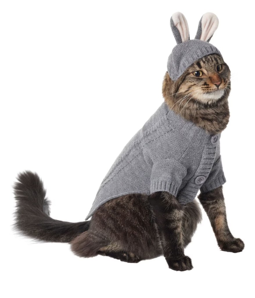 I’ve seen more realistic bunny costumes, but that would be dangerous with my dogs. They have been known to jump the fence to chase bunnies. I like this costume because I can skip the ears and dress him as a grumpy old man, go full Peter Cottontail.