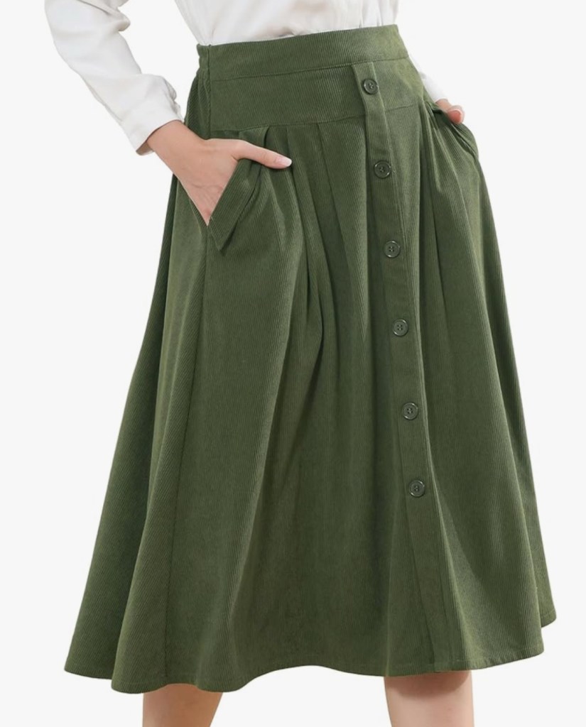 Then I bought this Green corduroy prairie skirt. Seriously, look at the pockets. All skirts should have deep, functional pockets like these. I’m short, so the skirt reaches my ankles and makes me feel like I’m from Little House on the Prairie, which isn’t too far off from my 10 wooded acre home.