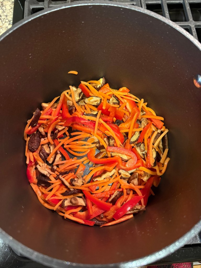 - Add the sliced bell pepper and carrots to the mushrooms, and saute until the peppers are slightly soft.