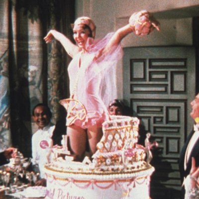 Of course Kathy isn’t doing a bunch of real acting either. She happens to be a chorus girl who jumps out of the cake at an industry party that Don and Lina are attending. Don gets her all flummoxed and she tries to throw a cake at him, but he ducks and it hits Lina in the face.