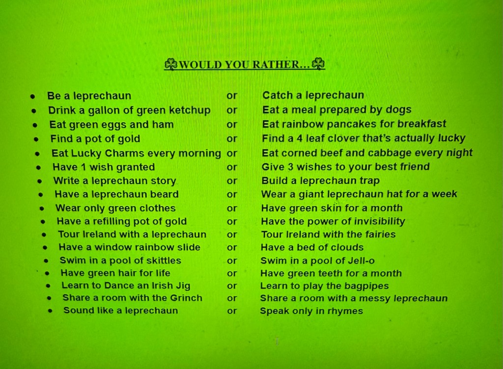 - Would you rather write a leprechaun story or build a leprechaun trap?